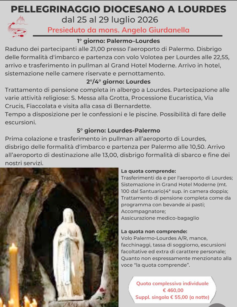 È organizzato dal 25 al 29 luglio prossimi il pellegrinaggio diocesano a Lourdes, promosso dall’Ufficio per la pastorale del tempo libero, turismo e sport guidato da don Giancarlo Tumbarello. Il pellegrinaggio sarà presieduto da monsignor Angelo Giurdanella. Durante le giornate che saranno vissute a Lourdes si parteciperà alle varie attività religiose: santa messa alla grotta, processione eucaristica, Via Crucis, Fiaccolata e visita alla casa di Bernardette. Durante il pellegrinaggio ci sarà la possibilità anche di fare escursioni. La quota di 460 euro (supplimento singola, 55 euro) comprende: trasferimenti da e per l’aeroporto di Lourdes, sistemazione in Grand Hotel Moderne (a 100 metri dal Santuario), accompagnatore, assicurazione medico e bagaglio. Informazioni e prenotazioni 3472256633 (don Giancarlo Tumbarello).