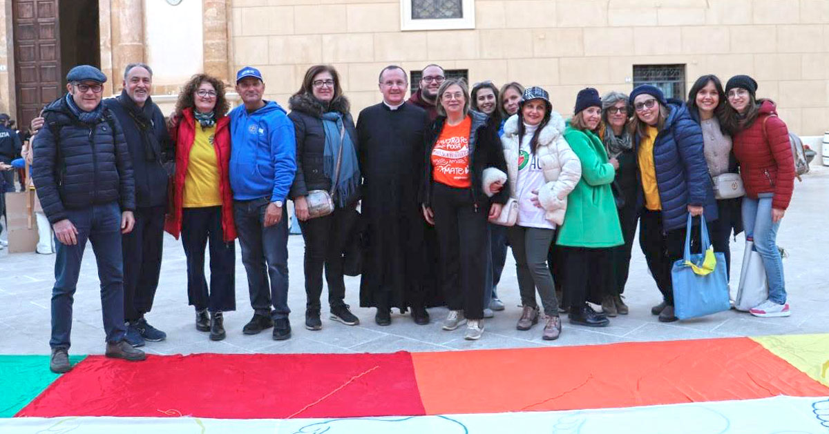 A chiudere il momento di preghiera in piazza della Repubblica è stato il Vicario generale don Gioacchino Arena che ha portato i saluti del Vescovo. Don Gioacchino ha voluto ricordare il momento particolare che la nostra diocesi sta attraversando in queste giornate, tra gioie e tristezze: «Gioie perché – ha detto don Gioacchino – vedere tanti ragazzi dell’Azione Cattolica e non solo coinvolti in una marcia per la pace non può che far gioire i cuori di tante persone; tristezza perché in questi giorni si è spento il nostro Vescovo emerito monsignor Emanuele Catarinicchia che di certo – ha concluso il Vicario – ci starà guardando da lassù gioendo insieme a tutti noi e che lo salutiamo con la preghiera del Padre Nostro». Al termine ci sono state due testimonianze: una da parte di suor Alessandra Martin, direttrice dell’Ufficio migrazioni e della mobilità umana della Diocesi e di Susanna Nizzola, presidente dell’Aps “Yalla”.